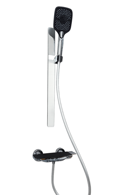 Clean white shower column featuring two integrated shelves, square overhead head and matching hand shower. Fits perfectly in light, minimalist bathrooms.