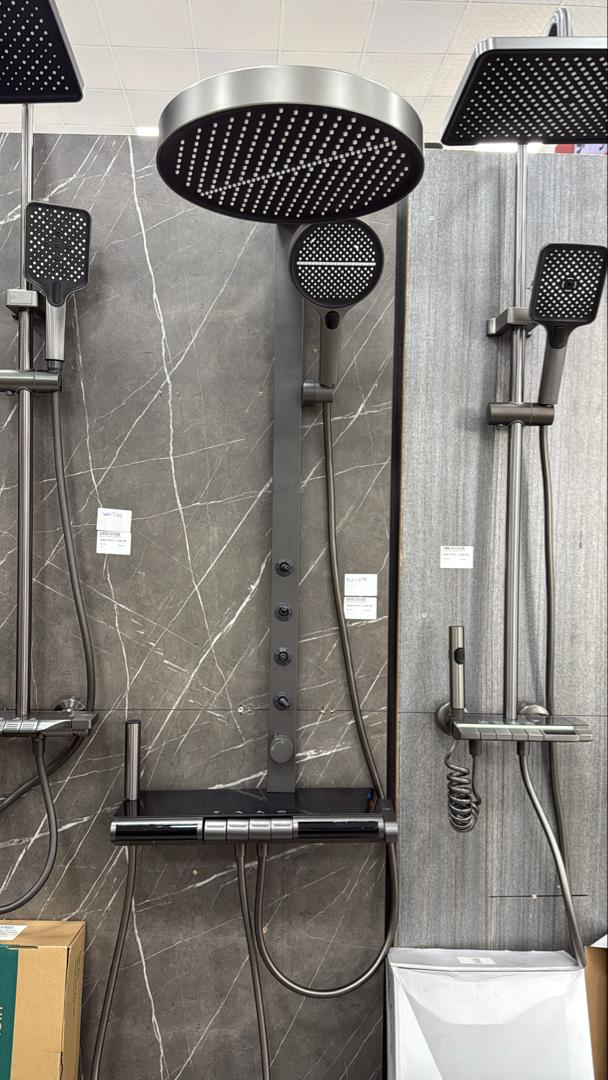 Matte black rain shower system with slim square head, hand shower and bar mixer. A strong, modern look that works well with dark tiles.