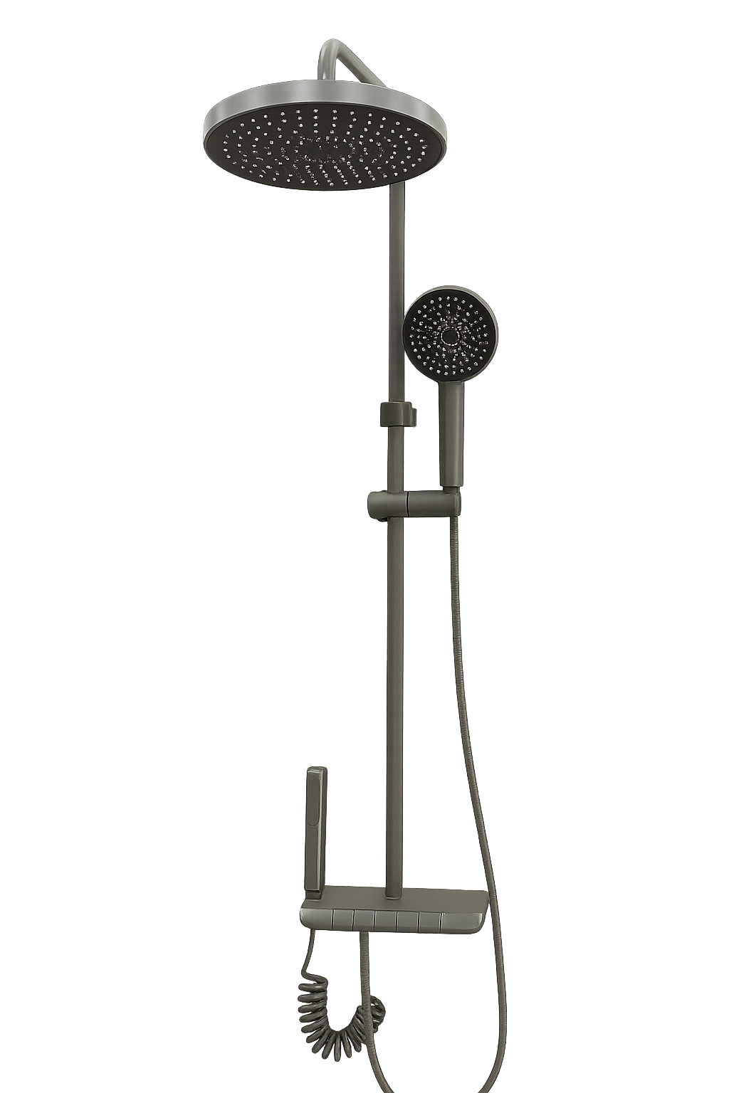 Minimalist matte black shower rail set with rectangular mixer shelf, slim hand shower and flexible hose. Ideal for pairing with separate ceiling head.