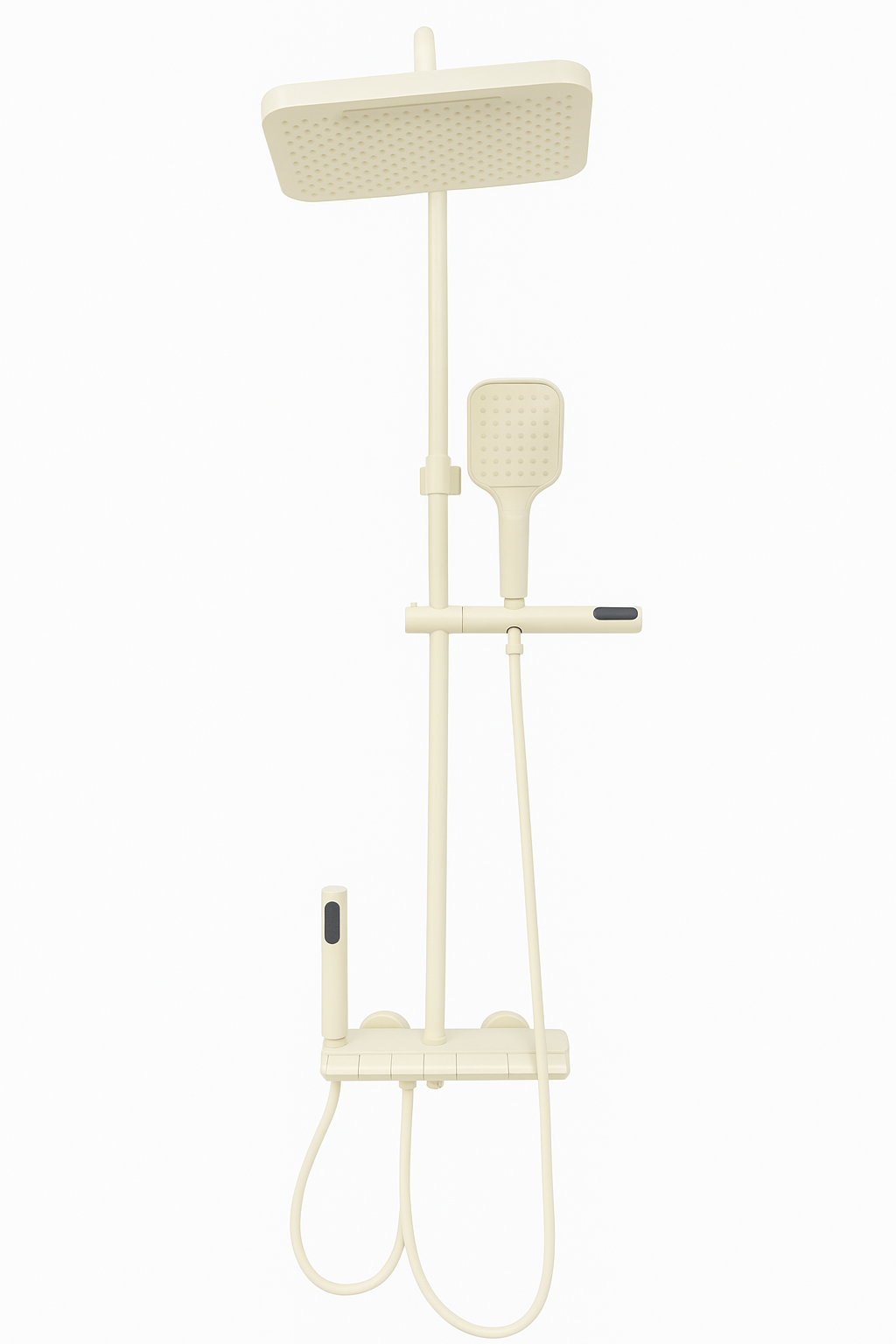 Soft ivory-coloured rain shower system with square head, hand shower and matching hose and mixer. Ideal for light, warm-toned bathrooms.